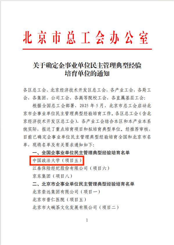 此项评选聚焦企事业单位民主管理提质增效,通过探索创新路径、深挖先进实践、重点培育标杆,着力发挥典型经验的示范引领作用,推动全国民主管理工作整体跃升。本次仅有3家企事业单位成功入围全国培育名单,而我校是其中唯一一所高校。获评此荣誉不仅凸显了我校民主管理创新实践的突出价值,更充分展现出我校在推进全国政法教育中心建设进程中,以民主赋能发展、以治理彰显效能的阶段性亮眼成果。
