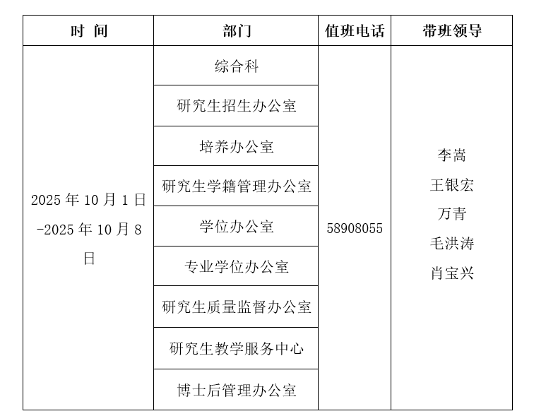 2025年研究生院国庆节假期值班表