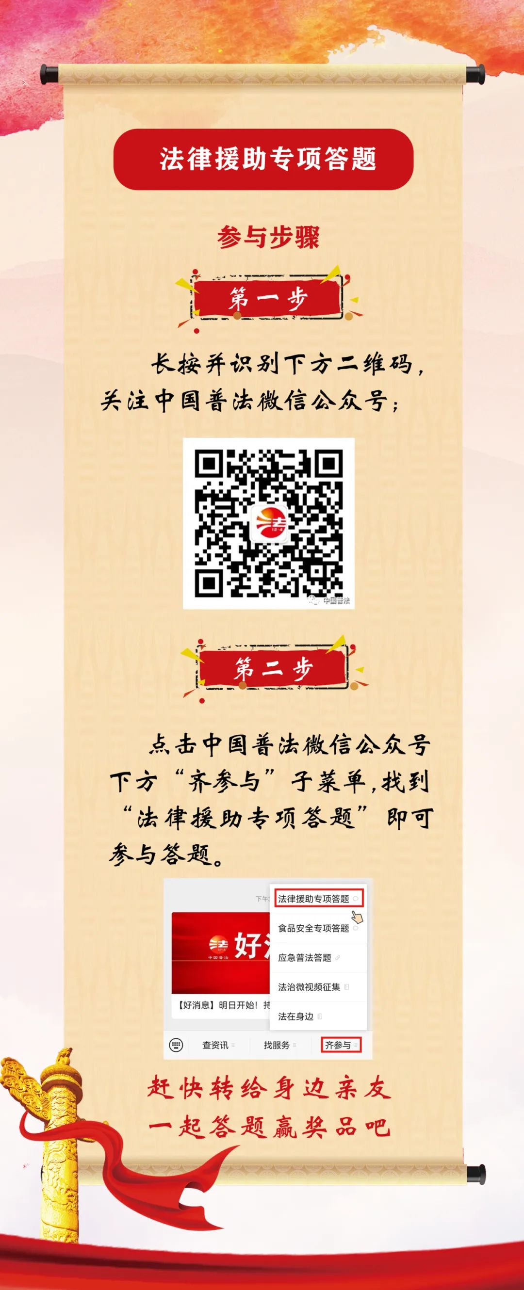 关注“中国普法”微信公众号,在手机下方子菜单“齐参与”中找到“法律援助专项答题”进入答题页面即可答题。答题前,网友须在个人信息页“所属地”的下拉菜单中选择个人所在的省(区、市)和地市,在“单位”栏填写个人所在单位,以便后台数据统计。