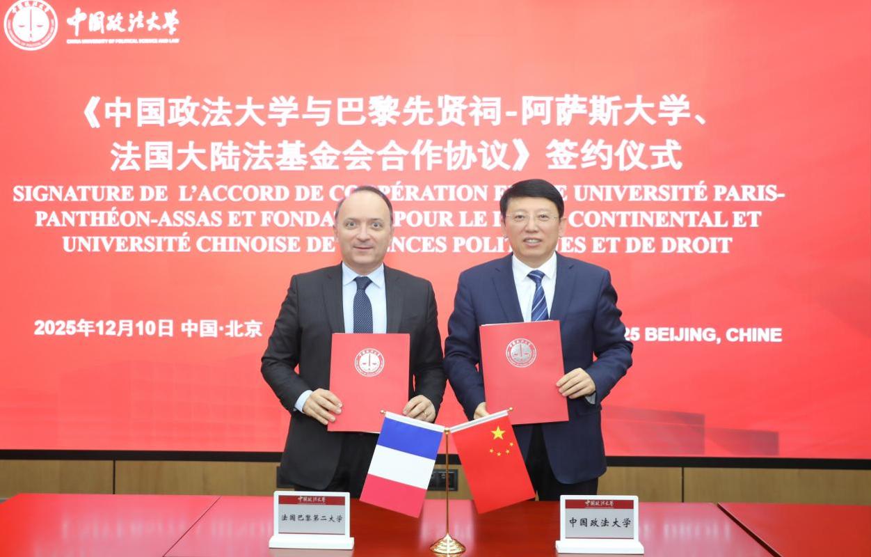 在莫逸飞等人的见证下,双方代表共同签署《中国政法大学与巴黎先贤祠-阿萨斯大学(巴黎第二大学)、法国大陆法基金会合作协议》,并为中国政法大学中法法学院揭牌。中法法学院设于比较法学院之下,将与中德法学院、中美法学院等共同形成极具特色的高水平涉外法治人才培养体系,将进一步推进我校区域国别研究与人才培养国际合作。